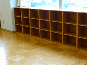 完成したボックスをオープンスペースに並べました。あとは耐震用に固定をし、番号シールを貼るだけです。ボックスには、体育館シューズや絵の具セット・書道セット・国語辞典などを入れる予定です。これでロッカーに余裕ができます。