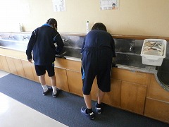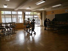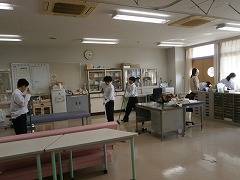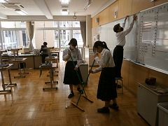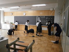 1日の終わりには、感謝の気持ちを込めて「清掃」を行います。本校は比較的新しい建物ですが、生徒のみなさんは丁寧に雑巾で床を拭いたり、机をつって運ぶなど、校舎を大切に扱う姿が見られます。伝統の「清掃」をこれからも継続していきましょう。