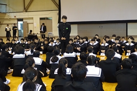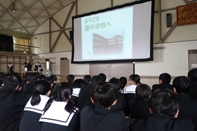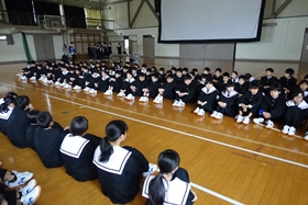 今日の1時間目は生徒会本部主催の対面式を実施しました。1年生はここで初めて先輩たちと対面。生徒会本部役員の紹介の後は3年生による英語劇が発表され、続いて港中学校をよりよく知るためのクイズが出題されました。1年生も何人かが解答者として選ばれましたが、みんな立ち上がって自分の名前を述べ、堂々と解答していました。