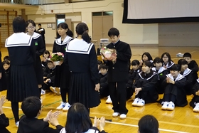 続いて1年生の代表からお礼の言葉が述べられ、最後に各クラスに花が贈られて閉会となりました。花は今後、それぞれの教室で大切に育てていきます。