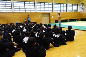 2時間目は学年集会。1年生は教室前にオープンスペースがありませんので、集会はほぼ武道場で実施することになります。今日の第1回学年集会では学年担当の先生から一人ずつ自己紹介をし、それぞれに1年生に期待することを話しました。大きくまとめると、学校のルールをきちんと守るという生活面、各教科の授業をしっかり頑張るという学習面の二つを頑張りつつ、互いの個性を認め合うことができる仲間になっていくことが私たちの願いであり、期待することであり、指導の目標でもあります。