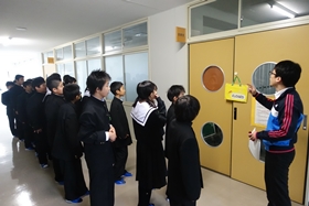 3限目は校舎見学(案内)の時間。クラスごとにルートを決め、担任の先生の解説を受けながら、特別教室の場所、エレベーターなどの設備を確認すると共に、職員室への出入りの方法についても教えてもらいました。4限目が校内の各所に分かれての町別集会だったので、みんな一生懸命に教室の名前や場所を覚えました。明日からは最初に登校した人が職員室に入室し、今日教えてもらった方法で教室の鍵を持っていくことなります。