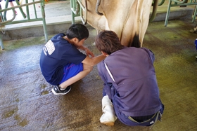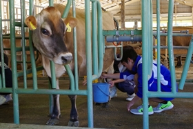 搾乳体験本番がスタートしました。一人ずつ係の方の説明をうけながら搾乳していきます。体験が終わった人から、アイスクリームをいただきます。