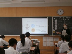 今日は、栄養教諭の井原先生が来校され、2年生に「食育教育」を行いました。今月は「コツコツメニュー」がテーマですので、「骨のでき方」について学びました。生徒のみなさんは、給食を食べながらも一生懸命「カルシウム」等、身体に必要な栄養素について考えることができました。