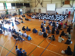 今日は浜田地区防災訓練が港中体育館であり、港中学校全生徒が参加しました。