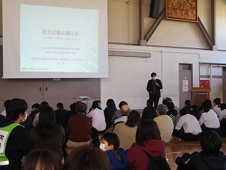まず、防災委員長さんから訓練の意義などの説明があり、その後、三重大学の川口先生から災害への対応についてわかりやすく教えてもらいました。