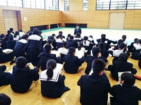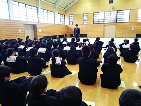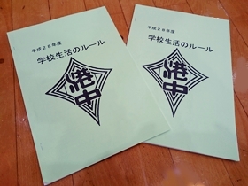 今日の6限目は「学校生活のルール」という冊子を教室で綴じたあと、これを持って武道場で学年集会を実施しました。この「学校生活のルール」には校則及び学校生活上の様々な約束事や「学校に置いていってもいいもの」、校外での生活の決まり事、災害緊急時の対応などが掲載されています。今日の学年集会では、その重点について説明しました。ご家庭の方でもご確認の上、不明な点があれば気軽に担任までお尋ね下さい。