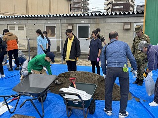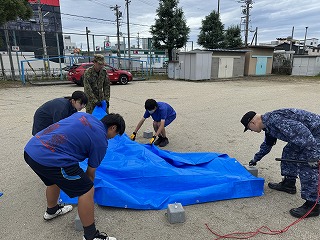19日(日)には、浜田地区連合自治会、NPO法人TSV2020四日市主催で浜田地区「防災スタンプラリー」が浜田小学校で行われました。本校からも、ボランティアとしてたくさんの生徒が参加をし、地域の方々に喜んでいただくことでやりがいを感じることができました。また、楽しく「防災訓練」が体験できるように、自衛隊や消防本部のプロにもきていただき一緒に土のうを作ったり、AEDの使用の仕方について学ぶことができました。生徒のアイデアを取り入れた「オリジナル・スタッフユニフォーム」を着て、やる気満々でボランティア活動をすることができました。