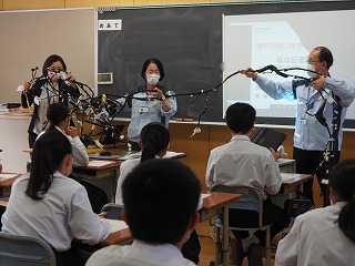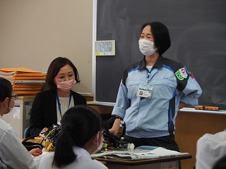 今日は住友電装から3名(谷さん、平田さん、宮本さん)と、美容室EDGEから倉重さんに学校にお越しいただき、それぞれのお仕事のお話を聞かせていただきました。