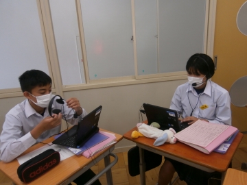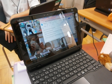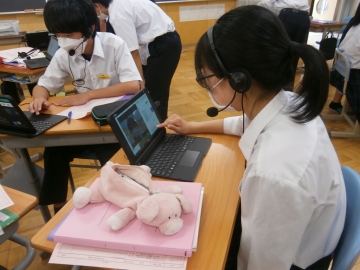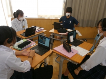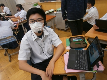 3年生の英語の授業では、タブレットで自分のスピーチを何度もチェックして、納得いくまで取り直していました。その後 google class room を使ってみんなで共用して評価し合いました。