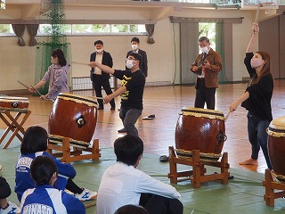 浜田子供諏訪太鼓保存会からチーム「不知火(しらぬい)」の皆さんにお越しいただき、3年生を対象に諏訪太鼓体験会がありました。