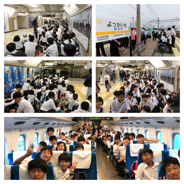 JR四日市駅から名古屋駅までは、区間快速を利用しているため、満員でした。その中でも、多くの生徒たちは、前日に指導を受けた「リュックは身体の前に持ち、まわりに気配りをしよう」を実践していました。私の近くに乗った班のメンバーを褒めました。写真は、
