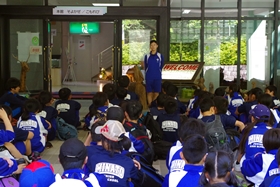 実行委員会の司会で入所式が始まりました。3日間お世話になる少年自然の家の方からお話を聞いています。この後は、まだ部屋に入らず、すぐにカヤック組とスポーツレク組に分かれて活動を始めます。
