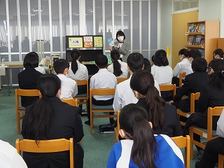 あと2週間で冬休みに入りますが、冬休み、生徒たちに読書に親しんでもらうため、今日はいくつかの学級でブックトークがありました。