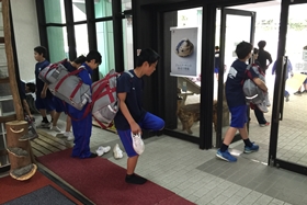 朝食の後、それぞれ部屋に戻り、荷物の整理や部屋の整頓を終え、大きな荷物を玄関に運んでいます。この後は掃除の時間です。