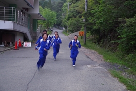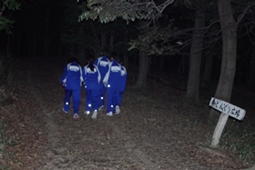 ナイトハイクが始まりました。19時の空はまだまだ明るいのですが、展望台に着くまでにはかなり暗くなる予想です。写真左上は、先発する私(味村)に置いていかれまいと猛追するA組1班のメンバーです。ちなみにひと班ごとに20秒置きにスタートします。
