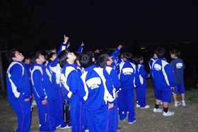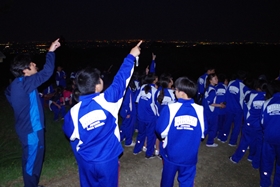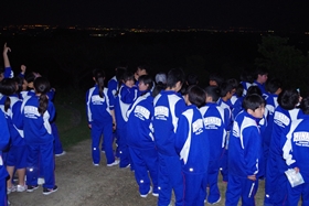 ここで長尾先生による星空に関する講義がスタート。中には今度の中間テストの理科で出題されそうなものも。最後に、全員で夜の展望台に登頂した記念に一枚。