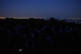 展望台に全班が到着しました。ここは電波の状態もよく、リアルタイムに更新できました。ここでの写真はすべてフラッシュを使ったものです。実際の明るさは写真右上(フラッシュなし)のような感じです。撮り方が上手くないので伝わらないかもしれませんが、とても夜景がきれいでした。今日は本当に好天に恵まれた一日でした。