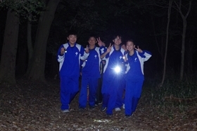 ところどころで私(味村)は隠れてみましたが、瞬く間にライトで照らし出されて見つけられ、この笑顔を向けられます。かなりの上り道ですが、怖がりながらもみんなで楽しんで展望台を目指しています。