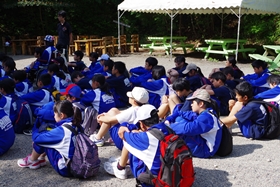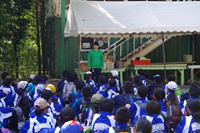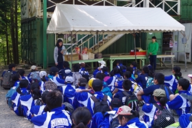 朝食を食べて間もないのですが、野外炊事の時間になりました。少し上にある炊事場へ向かいます。到着後、岩田先生からの説明、続いて自然の家の方からの説明を聞きます。