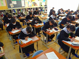 このドリル学習というのは、3年生に向けて学力を向上させるために、毎日帰りの学活の前半に行うものです。まずは1月30日までは基礎学習(漢字と計算)の取り組みを行います。1月30日からは5教科の3年間の総復習のプリント学習へと移行していきます。この毎日の10分間の取り組みを継続して、ぜひ力をつけていってもらいたいと思います。また、10分間の取り組みだけでなく、家庭学習で反復をすればさらに力をつけることができるので、この取り組みを家庭学習につなげてもらえることを期待しています。
