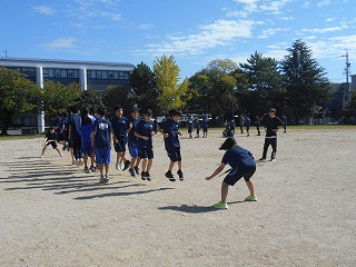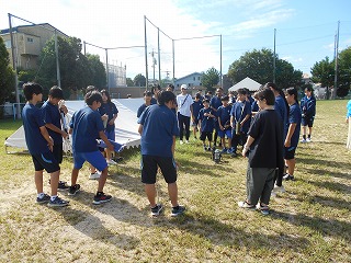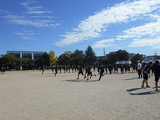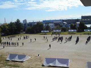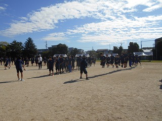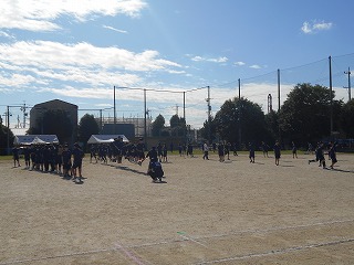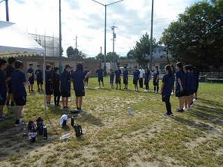 今日の1限目も「群別練習」を行いました。「大繩跳び」の記録更新を目指したり、「バトンパス」で時間をいかに短縮させたりするかで、声を掛け合っていました。3年生の群リーダーがテキパキと指示を出して、1・2年生も頑張って先輩についていく姿が見られました。日に日に、生徒たちが成長する姿には目を見張るものがあります。最後には群全員で振り返りをし、明日の練習につながるような意見交換をすることができました。