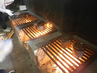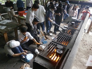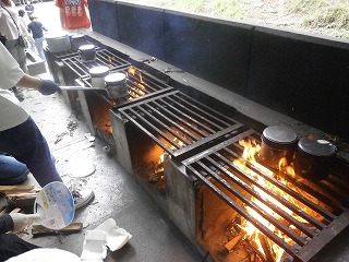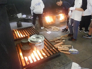 お鍋でお肉と野菜をいためたら、水を加えてしばらく煮込み。同時に飯盒でご飯も炊いています。今日のお昼ごはんはもしかして、定番のあのメニューかな。