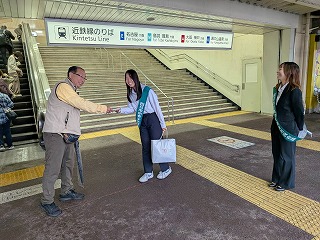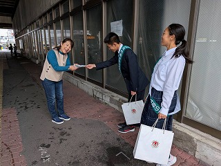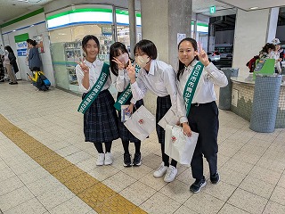 10月26日(日)の午前には、前期・後期生徒会本部役員が近鉄四日市駅付近で「街頭啓発活動」のボランティア活動を行いました。これは、四日市市青少年育成市民会議主催で、「大人が変われば、子どもも変わる」という運動の推進活動です。生徒のみなさんは、啓発チラシを熱心に配付してお手伝いをすることができました。