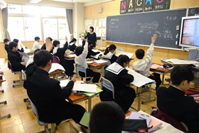 今日の4限目の社会の授業は「地形図の見方」について学習しました。前回までの授業で読み方の基本については学習していましたので、今日はまず四日市市近辺の地形図を使って、前回の復習をしました。みんな積極的に発表します。