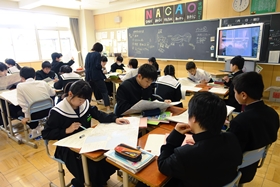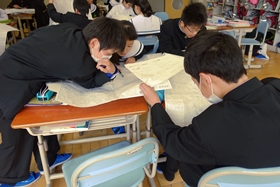 後半は応用問題。まだこの学習に入っていないクラスもありますので詳細は秘密ですが、先生から配布されたプリントに書かれたストーリーを読みながら、少人数グループで特定の場所を探していくグループワークをしました。地形図にはまだまだ慣れていませんし、市内各所の地理的知識もそう深くはないので、かなり時間がかかっていましたが、どのグループもみんなで意見を出し合って一生懸命に考えていました。