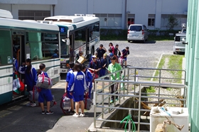 予定より早く自然の家に着きました。荷物を置いて再びバスに乗り、ふれあい牧場に向います。