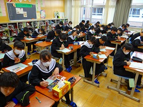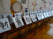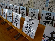 好きな言葉を色紙に書いて、てん刻で落款(らっかん)を押しました。「夢」「笑顔」「感謝」などを、楷書や行書で表現しました。練習に2時間使いましたが、いざ本番になると、緊張で手が震える姿が多く見られました。おのおのが心を込めて書いた世界で一つだけの貴重な作品です。ご家庭に飾っていただけると嬉しいです。