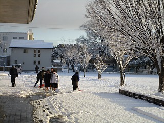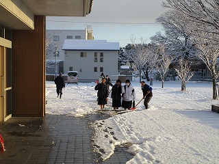 今朝は一面真っ白で、予想を上回る積雪に教職員も生徒もびっくりしました。正門から昇降口までも真っ白に埋め尽くされていたので、生徒たちの安全を考え、早く出勤をした教師が雪かきをして、生徒たちが歩きやすいように道を作る作業を行いました。誰もケガをしなくてよかったです。