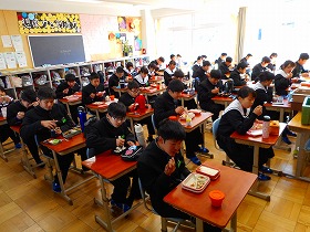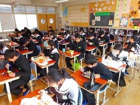 (今日の昼食はテストを受ける形で全員が前向きで食べました。いつもよりも静かです・・・)