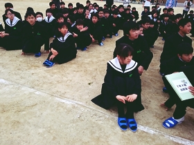 グランドへの避難後は、非常階段を使って初めて屋上まで移動しました。港中学校の屋上にはかなり広いスペースがありますが、その中で非常時に避難し、整列する場所を確認し、最後に防災担当の先生や校長先生から、防災に関わる話を聞きました。