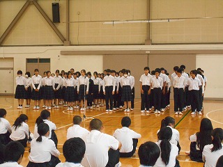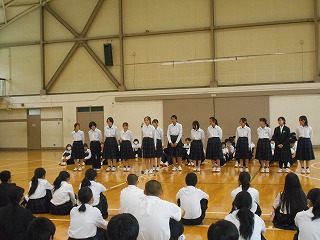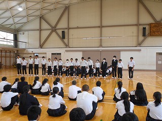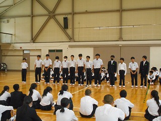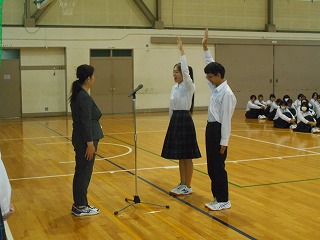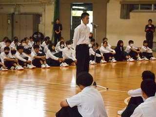 認証式に続いて、「新人戦壮行会」を行いました。各新チームが意気込みを話した後、代表選手が「選手宣誓」をしました。「感謝の気持ち」「礼儀正しさ」「ベストを尽くしたプレー」等、港中らしい決意を聞くことができました。試合は17日(金)、18日(土)を予定しています。港中の代表として、勇姿を見せてきてほしいです。