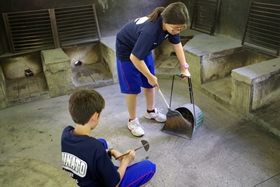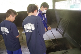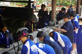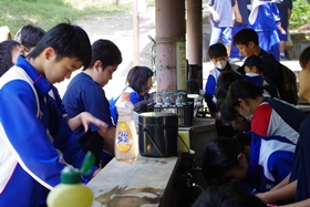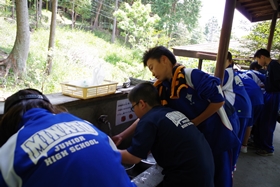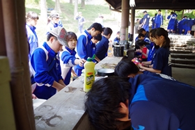 片付け作業の真っ最中です。点検が待っています。ほんの少しの汚れも許されない厳しいものです。ここまでは予定よりかなり早い時間で活動できましたが、果たして時間内に点検をクリアできるでしょうか。もちろん、食器だけでなく、かまどもきれいにしなければなりません。