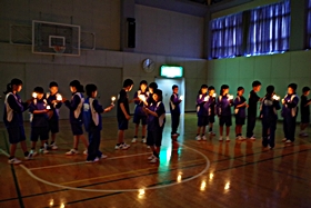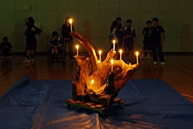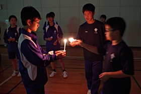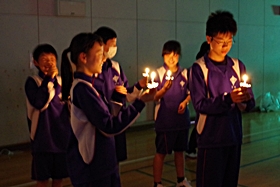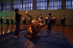 キャンドルファイヤーが始まりました。営火長の校長先生が入場し、書記に分火、さらに班長に分火し、メインキャンドルにも火が灯ったところで「遠き山に日は落ちて」をみんなで歌いました。そして校長先生からのお話を聞きました。ここまでで序盤が終了です。