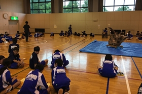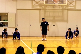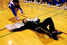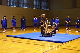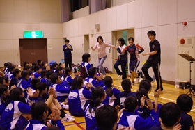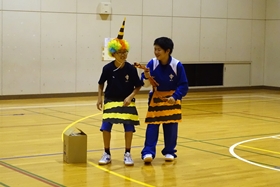 続くA組の企画は学年全員参加の「へびジャンケン」。チームを決めて対決していきます。先生チームと生徒チームとの対戦もありました。(写真左下) そして最後は先生たちの出し物でした。(写真右下)