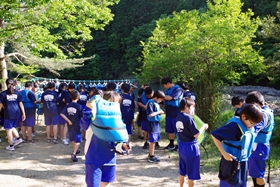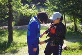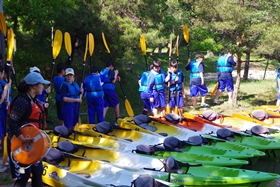 いっぽうのカヤック体験。大門池前の広場に集合し、最初に係の人からの説明を受けます。そしてライフジャケットを着用します。