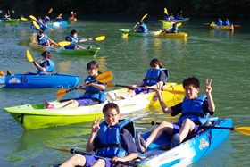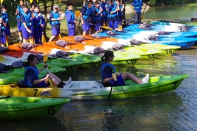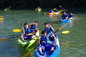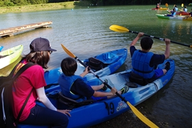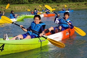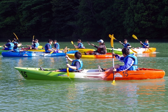 すぐにみんな慣れて思い思いにカヤックを楽しんでいます。先生とペアを組んだ人もいます。中には校長先生とペアを組んだ人も。