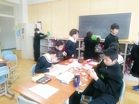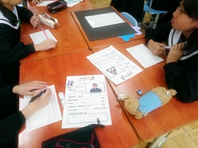 5限目の学活は昨日の続きで班ポスターなどの掲示物を作成しました。また、3限目に一人ずつ廊下で個人写真を撮りましたが、その写真を自己紹介カードに貼り、完成させました。この自己紹介カードは1年間、教室後方に掲示されます。
