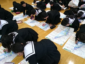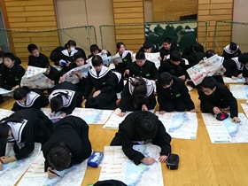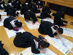 「津波避難マップ」を配布し、まず港中学校の場所、自宅の場所を地図上で確認しました。(上の写真)そして、それらの場所が浸水区域内にあるのかどうか、どれくらいまで浸水するのかなどを確認しました。このマップも多くの人が「家に貼ってある」と言っておりましたので、すでにご存知のものだとは思いますが、防災手帳と共に今日持ち帰りましたので、ご家庭で役立てて下さい。なお、前述した「のっぺらぼう」防災手帳」も、この「津波避難マップ」も