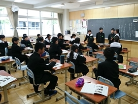 「家族防災手帳(大人版)」を配布し、災害緊急時の心構えや実際の避難方法、準備しておくべきことなどを話しました。この「家族防災手帳」は小学校では(子ども版)が配布されていましたが、中学生以上は大人版が配布されます。災害時に備えての備品チェックリストや家族で話し合って書き留めておく項目なども掲載されています。すでにご覧になっている方も多いと思いますが、持ち帰ってきちんと保管しておくようにと指導しましたので、ご家庭でも再度内容を確認していただき、役立てて下さい。この手帳内には災害時に情報を得るためのホームページのアドレスやバーコード、災害伝言ダイアルの使い方なども掲載されています。