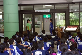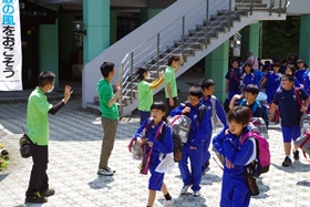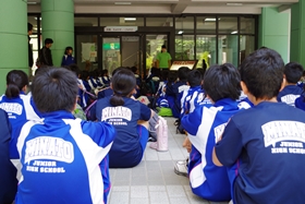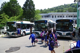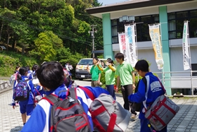 自然の家の方に見送っていただき、バスに乗車。港中学校へ向かいます。