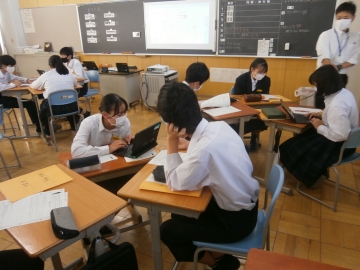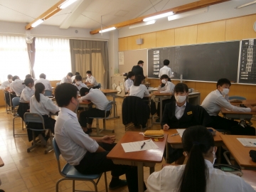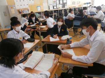 「重役会議」という人権学習を行いました。内容としては、自分たちが会社で採用する立場となり、なぜ採用するのか、選んだのかの理由を明確にして考えるというものです。立場をかえて考えることで相手が何を大切にしているのかに気づき、これから自分たちがつけていきたい力を考えることにつながりました。これから進路を考えていく中で、高校だけでなく、その先を見て選んでいけるようになりたいです。