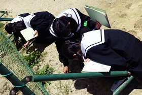 同じ3時間目の後半、B組の理科の授業ではタンポポとスズメノカタビラの根を比べるために、校庭へ出て探し、実際に抜いてみて観察をしていました。