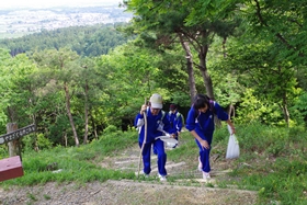 待つこと45分、最初の班が来ました。以降、続々と到着しました。昨日のナイトハイクで登ってきたきた時の「はぎのこみち」から来る班もありますが、炊事場から直上に登る急な登り坂のルートもあり、到着した時はかなり汗をかいていました。とりあえずは水分補給です。