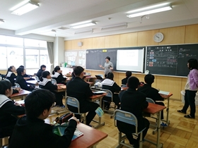 今日の2限目の授業風景です。A組は社会の授業。書画カメラと電子黒板を使いながら、世界の様々な国や地方を地図帳などで確認する内容でした。途中、活発に発言する場面も見られました。(写真左上)