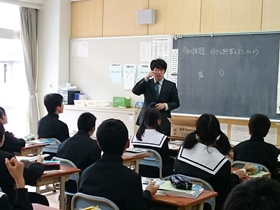 C組は英語の授業。今日から港中学校に英語指導員として来ていただいたクリスティン先生の1回目の授業でした。ここでもパソコンとプロジェクターを用いてクリスティン先生の自己紹介を聞き、後半は聞きとった様々な内容について答えるクイズ形式で授業が進められていました。(写真右上)